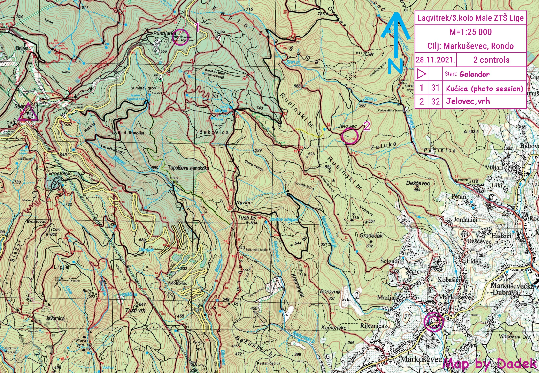 KONCEPT Natjecatelji se prijavljuju u dvije grupe, po vlastitom nahođenju: cesta ili mrcina. Start je zajednički u 10:00. Cestovnjaci trče po sljemenskoj cesti do vrha Medvednice (terasa Vidikovca podno TV-tornja), a traileri sami biraju put do istog vrha, s tim da ne smiju koristiti cestu (osim što je jednom moraju preći). Sada objavljujemo kartu s dvije kontrolne točke, a preostale dvije će biti tajna koju ćete saznati tek na vrhu Sljemena kad završite prvi dio trke. Tamo svi dobivaju kartu Medvednice sa sve 4 ucrtane kontrole koje moraju proći u drugom dijelu trke, na spustu ka Markuševcu. Natjecateljima u trailu se na kraju dodaje 7 minuta na ukupno vrijeme, koliko je otprilike brži prvi dio njihove staze u odnosu na cestu. Ako misle da je puno neka idu na cestu. Na kontrolnim punktovima će biti naljepnice koje treba nalijepiti na drugu stranu karte kao dokazni materijal da su ih prošli. Nema obavezne opreme, ali se preporučuje kompas i mobitel (u slučaju gubljenja).